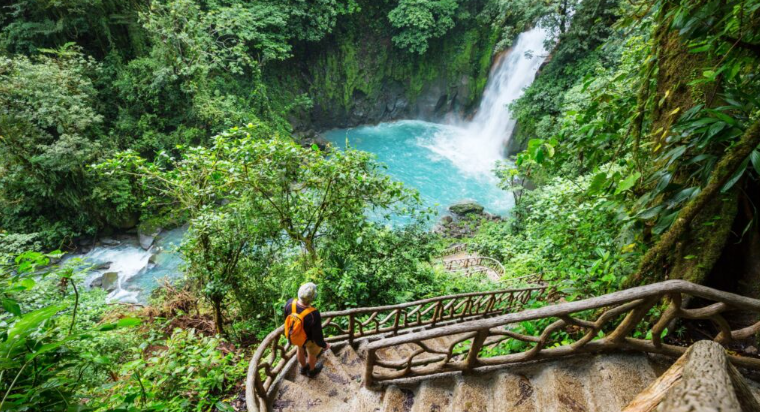 The Majestic Rio Celeste Waterfall Descend the stairs to witness the breathtaking sight of the celestial blue waterfall dropping into a deep turquoise pool. It is one of the most photographed spots in Costa Rica!